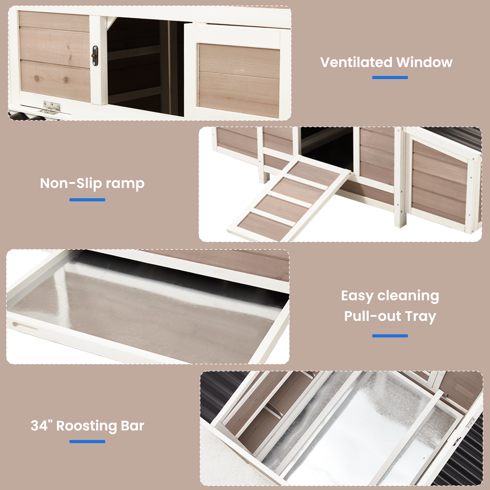 - Healthy Living Design – 4 entrances + side vent for airflow, plus raised perches to protect hens’ feet.