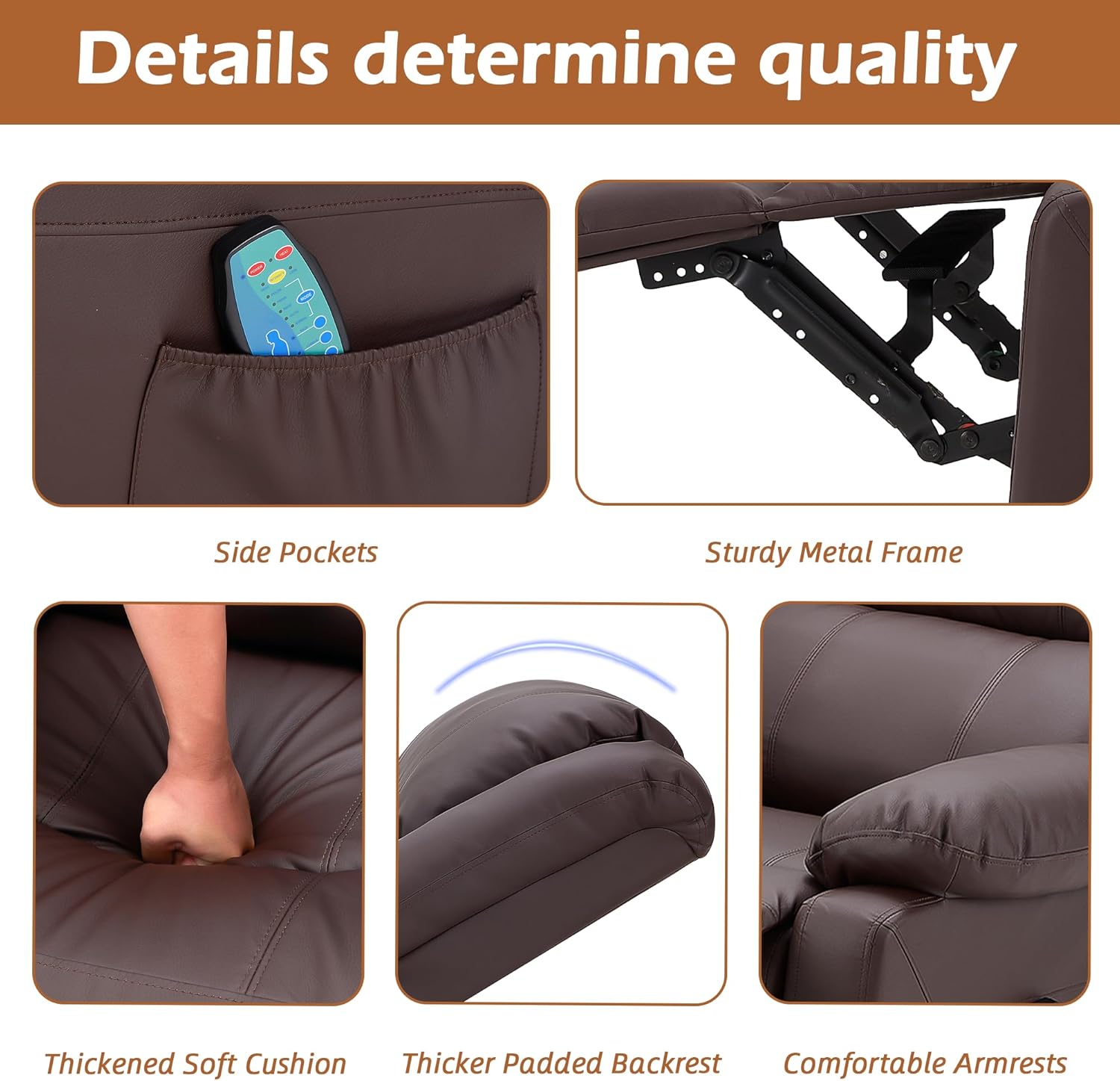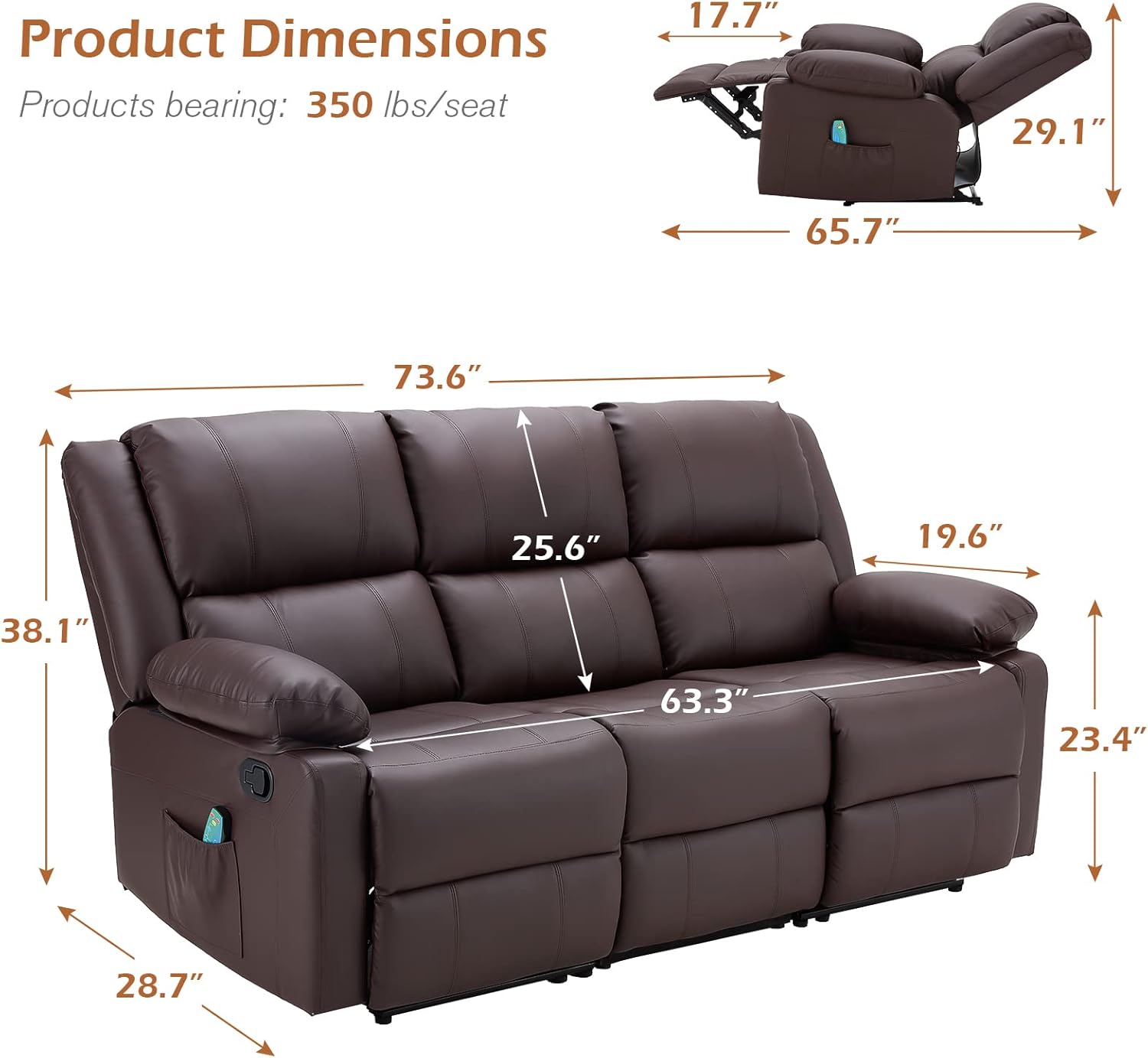 YODOLLA 3 Seat Leather Recliner Sofa with Massage Heated Function, Home Theater Seating Chair in Brown