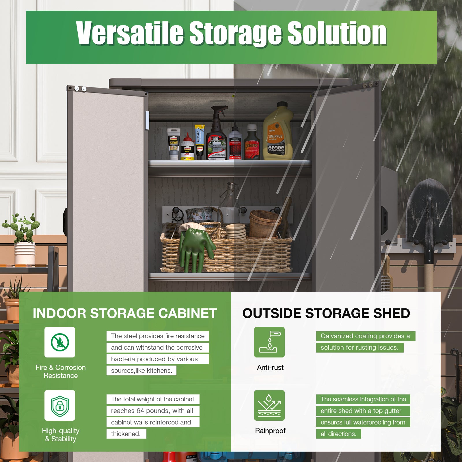- 🧹 Organized Storage, Your Way Inside, you’ll find 3 adjustable shelves and double doors that open wide for easy access. Whether it's tall brooms, garden shears, or extra cleaning supplies, the 13cm adjustable shelf height lets you fit it all comfortably.