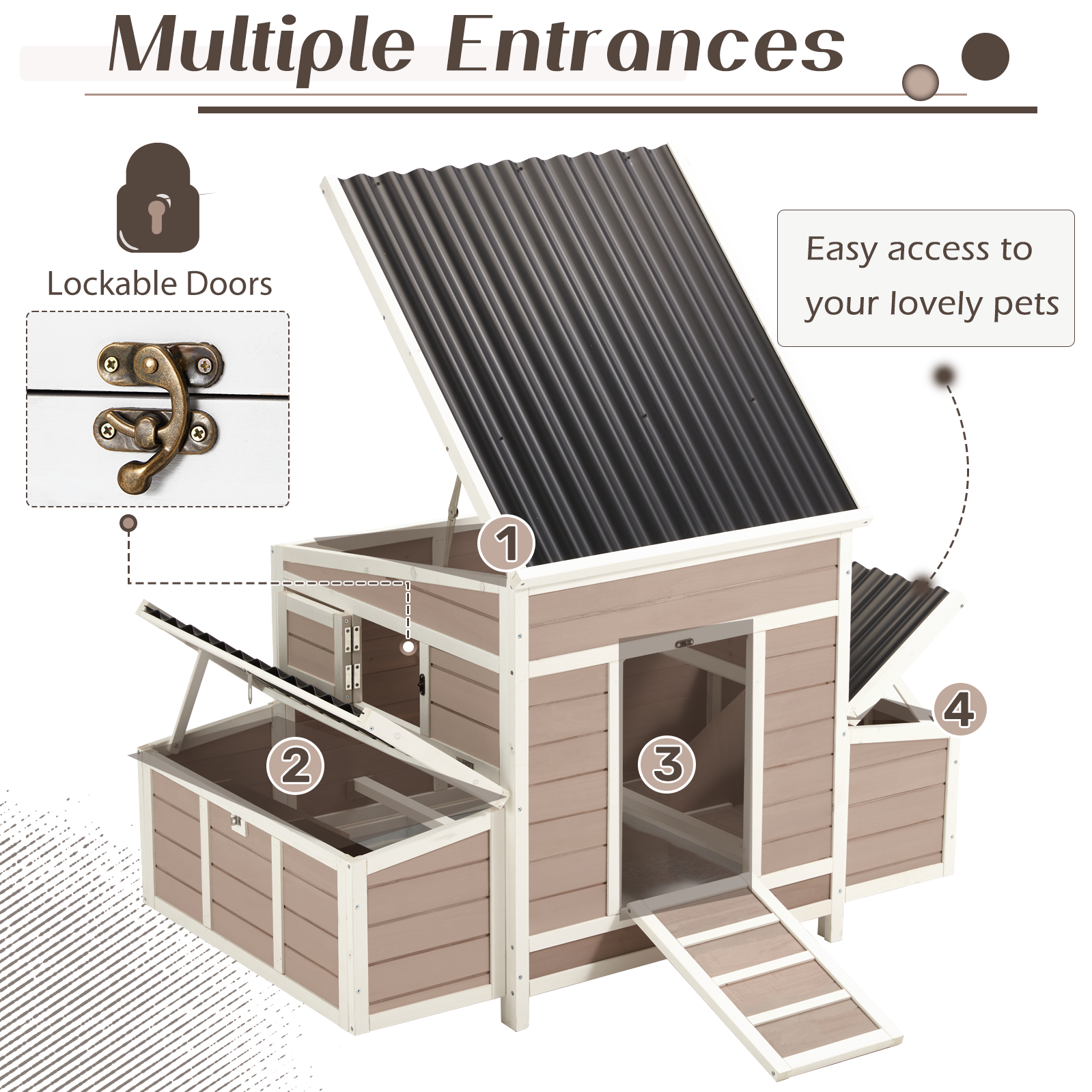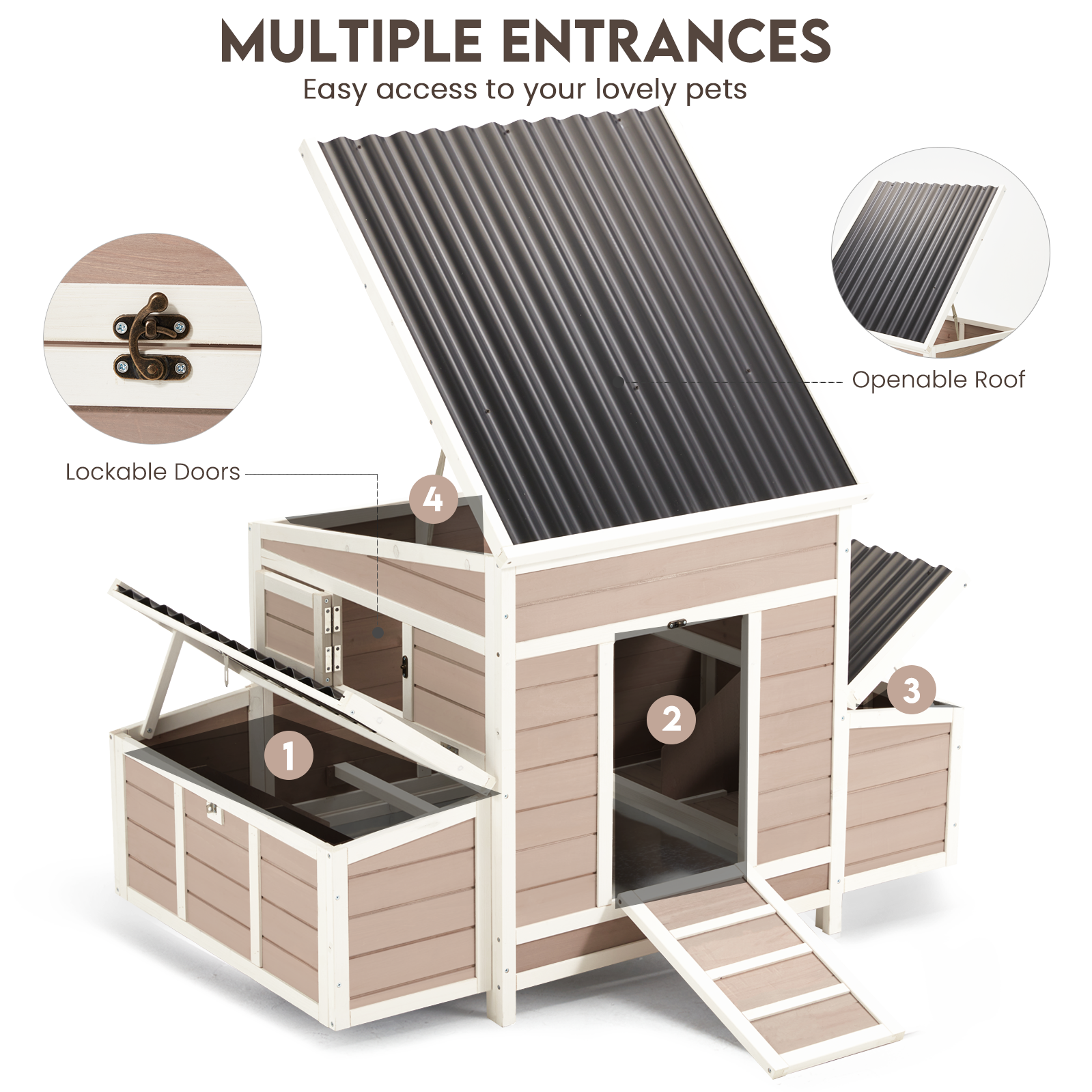 - Multiple Entrances --1 side vent and 4 entrances to maintain good air circulation and easy access to your lovely chciken. The reasonable construction contributes to the health of the chickens and thus increases the productivity of the chickens