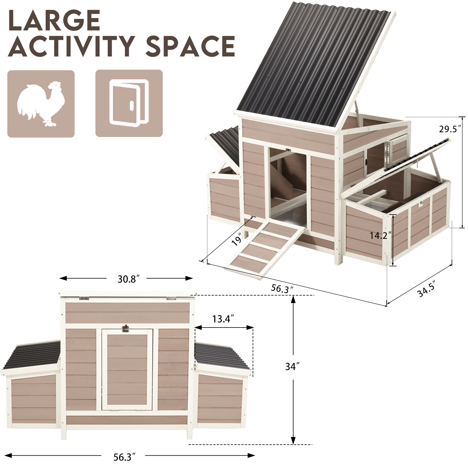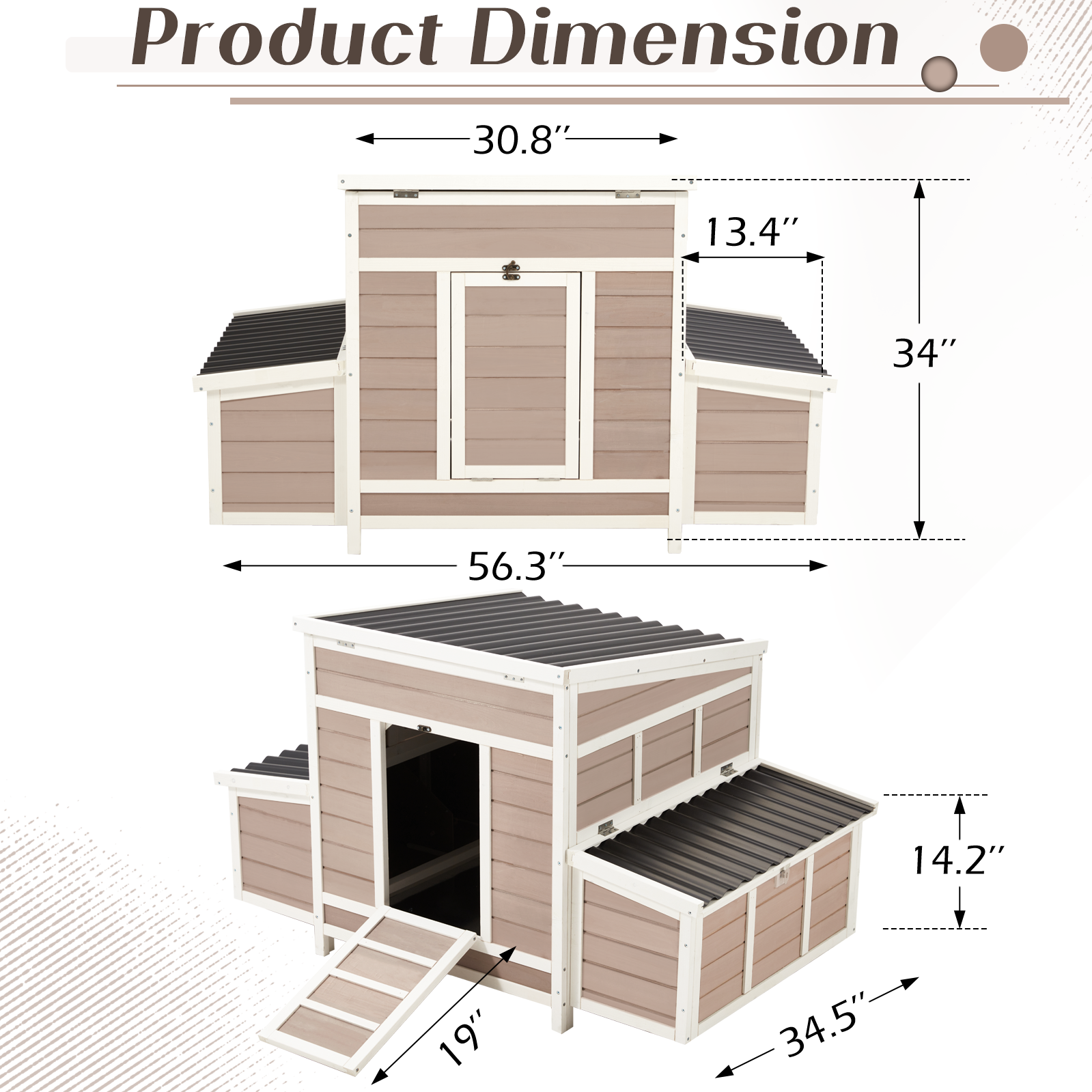 - Raised Perches --The eco-friendly chicken house is equipped with two widened and thickened wooden perches for roosts to protect sensitive feet. Overall Chicken house dimension: 56.3"L x 34.5"W x 34"H.