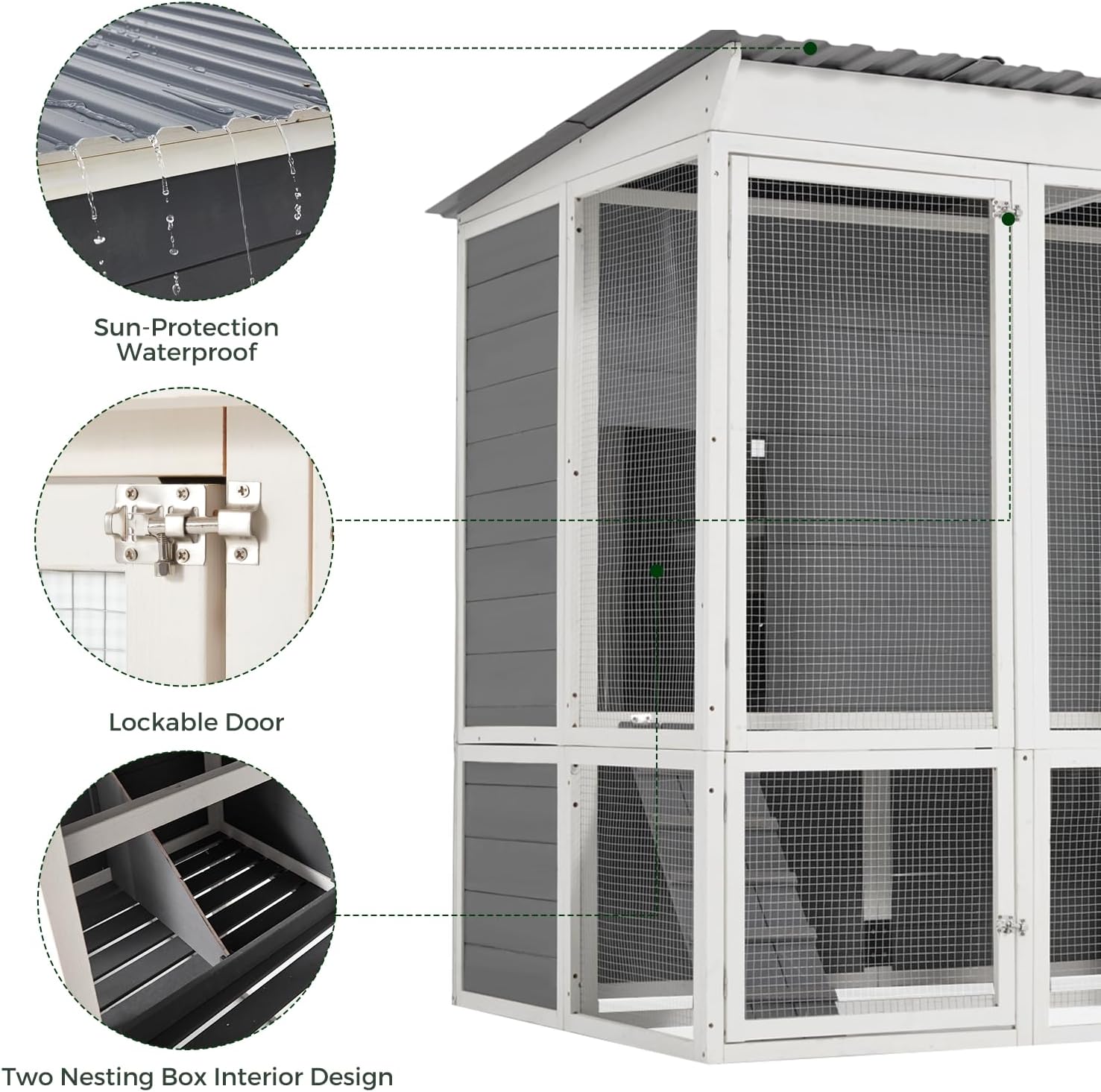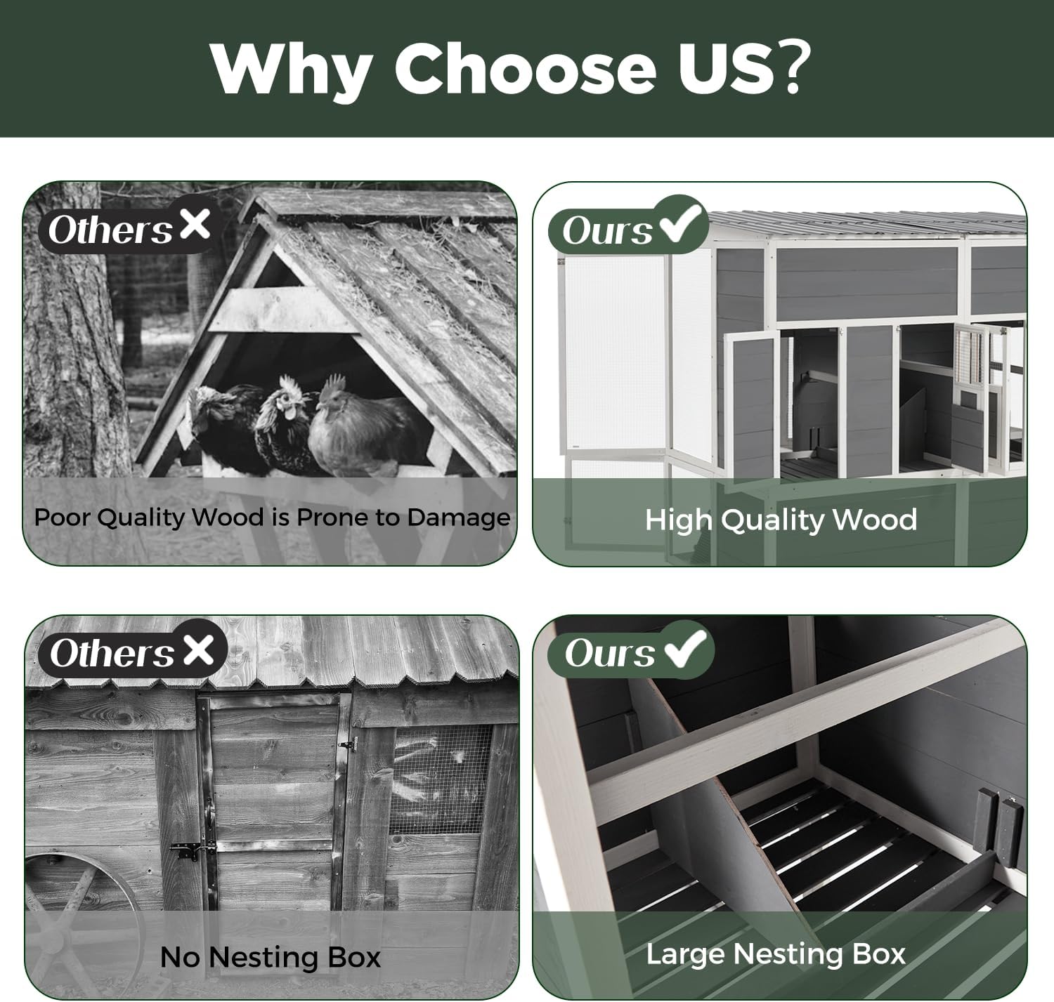 - 【Safe & Durable Construction】Built with predator protection in mind, all doors are fitted with secure metal latches to prevent escape and keep out unwanted visitors like raccoons and foxes. The wooden chicken coop frame is made from rot-resistant, heavy-duty timber, and tightly woven metal mesh adds an extra layer of defense.