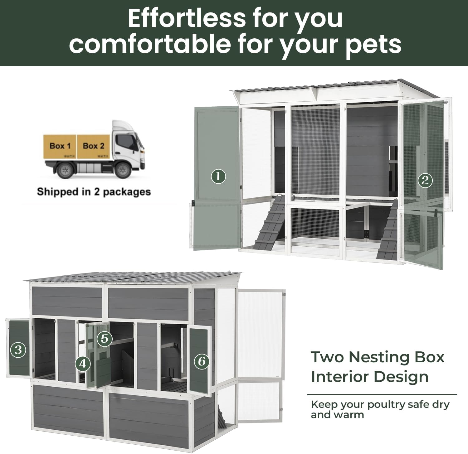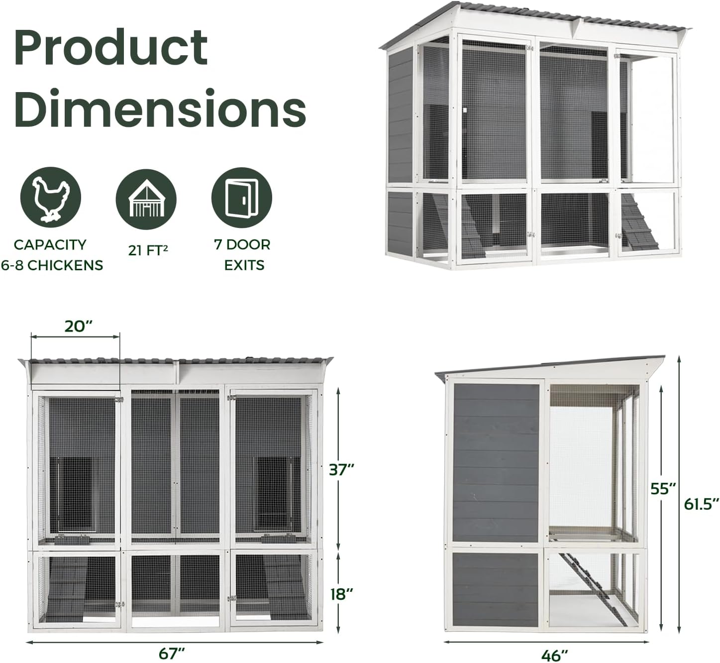 - 【Spacious Design for 8 Chickens】With a generous size of 67''L × 46''W × 61.5''H, large chicken coop comfortably houses up to 8 grown chickens. Featuring two separate roosting areas and four nesting boxes, this thoughtfully divided layout offers ample space for resting, egg-laying, and free movement.