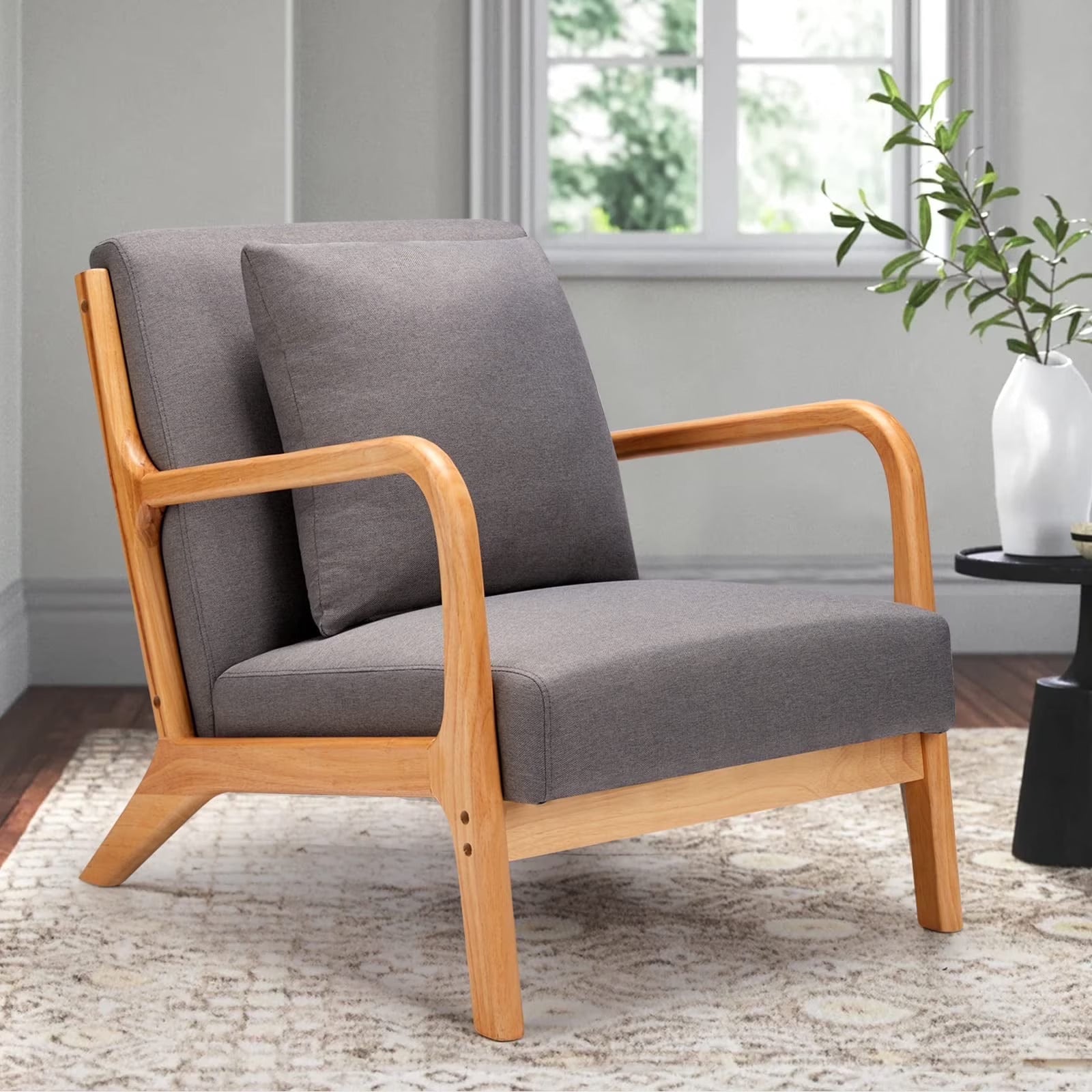 YODOLLA Mid Century Grey Fabric Accent Chair with Wooden Armrests & Cushio