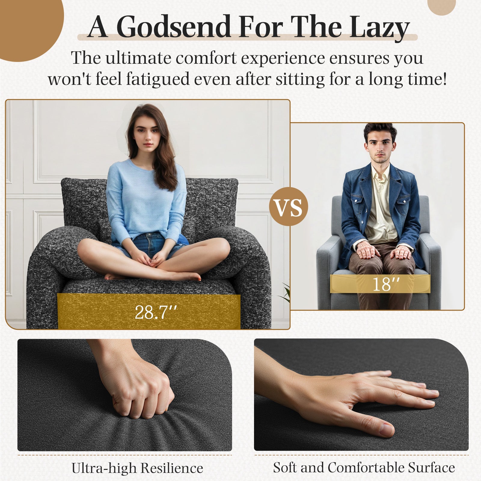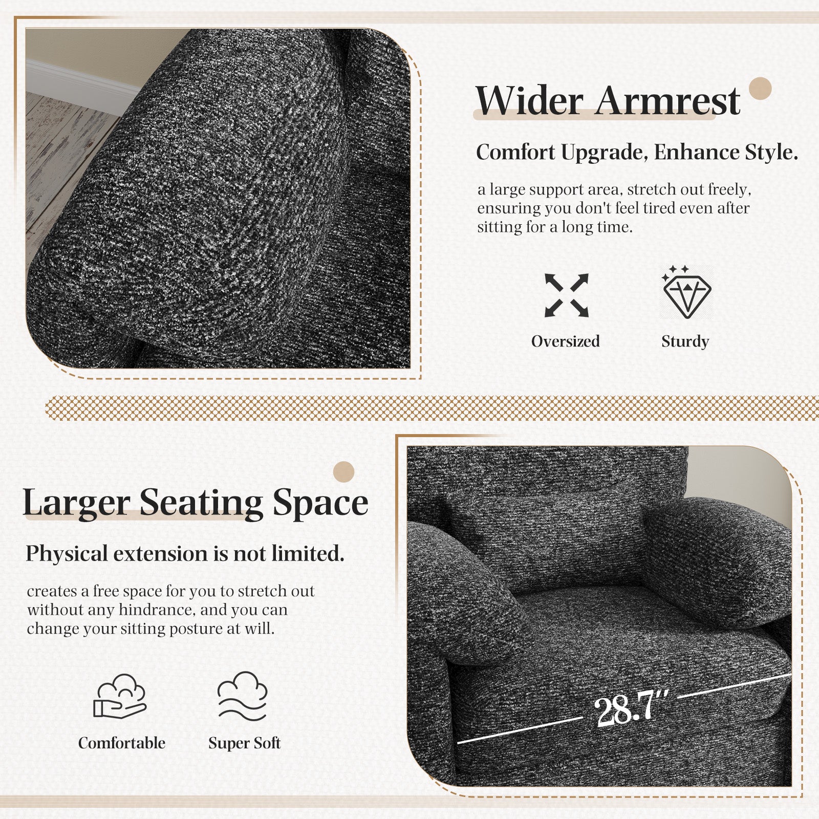 - We’re talking serious lounging potential here. The oversized seat gives you plenty of room to curl up with a book, stretch out your legs, or simply unwind after a long day. No cramped corners—just pure, relaxed comfort.