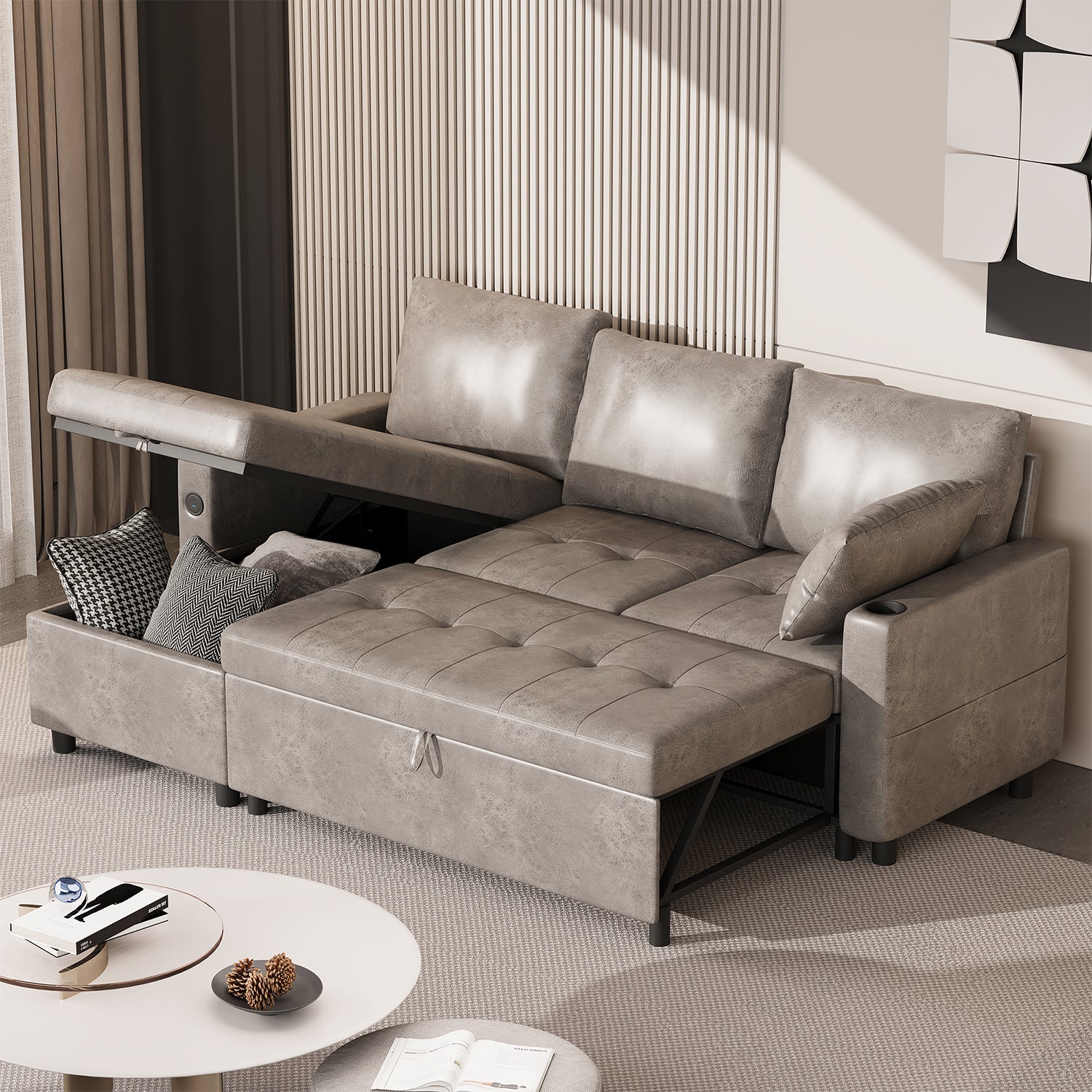 YODOLLA Sofa Bed, 3 in 1 Sleeper Sofa with Storage Chair, Faux Leather L Shape Couch, Sectional Pull Out Sofa Bed Mid Century Modern Couch for Living Room Clearance, Comfy Sleeper Couch in Grey